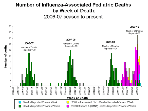 In previous years, it has been rare to see 2 or more influenza-related pediatric deaths in the US prior to December or January. This year, pediatric deaths due to 2009 H1N1 flu began to be reported in May. (See graph below, MMWR week 1 is the first week, of the year with 4 or more days and the last week of the year is 52 or 53. The bars are coded blue and green for seasonal or undifferentiated influenza and pink or yellow for 2009 H1N1 flu.)