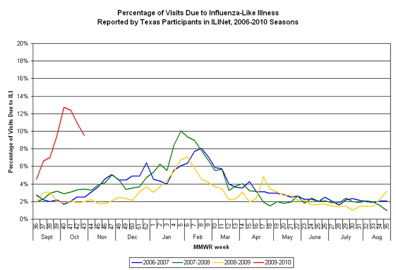 In Texas the total number of pediatric deaths for 2007 and 2008 were 13 and 9 respectively. There have been 29 pediatric deaths due to H1N1 flu reported so far, with 11 deaths in September and 10 in October. We don’t know how the pandemic outbreak will play out and what its role will be during the coming more traditional flu season. Flu activity is currently widespread in almost every state including Texas, but regional epidemiologists have reported that there are signs that the number of cases is currently going down. Influenza