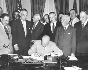 President Eisenhower signing HR7786, changing Armistice Day to Veterans Day. From left: Alvin J. King, Wayne Richards, Arthur J. Connell, John T. Nation, Edward Rees, Richard L. Trombla, Howard W. Watts Later that same year, on October 8th, President Dwight D. Eisenhower issued the first "Veterans Day Proclamation" which stated: "In order to insure proper and widespread observance of this anniversary, all veterans, all veterans' organizations, and the entire citizenry will wish to join hands in the common purpose. Toward this end, I am designating the Administrator of Veterans' Affairs as Chairman of a Veterans Day National Committee, which shall include such other persons as the Chairman may select, and which will coordinate at the national level necessary planning for the observance. I am also requesting the heads of all departments and agencies of the Executive branch of the Government to assist the National Committee in every way possible." On that same day, President Eisenhower sent a letter to the Honorable Harvey V. Higley, Administrator of Veterans' Affairs (VA), designating him as Chairman of the Veterans Day National Committee. In 1958, the White House advised VA's General Counsel that the 1954 designation of the VA Administrator as Chairman of the Veterans Day National Committee applied to all subsequent VA Administrators. Since March 1989 when VA was elevated to a cabinet level department, the Secretary of Veterans Affairs has served as the committee's chairman. The Uniform Holiday Bill (Public Law 90-363 (82 Stat. 250)) was signed on June 28, 1968, and was intended to ensure three-day weekends for Federal employees by celebrating four national holidays on Mondays: Washington's Birthday, Memorial Day, Veterans Day, and Columbus Day. It was thought that these extended weekends would encourage travel, recreational and cultural activities and stimulate greater industrial and commercial production. Many states did not agree with this decision and continued to celebrate the holidays on their original dates. The first Veterans Day under the new law was observed with much confusion on October 25, 1971. It was quite apparent that the commemoration of this day was a matter of historic and patriotic significance to a great number of our citizens, and so on September 20th, 1975, President Gerald R. Ford signed Public Law 94-97 (89 Stat. 479), which returned the annual observance of Veterans Day to its original date of November 11, beginning in 1978. This action supported the desires of the overwhelming majority of state legislatures, all major veterans service organizations and the American people. Veterans Day continues to be observed on November 11, regardless of what day of the week on which it falls. The restoration of the observance of Veterans Day to November 11 not only preserves the historical significance of the date, but helps focus attention on the important purpose of Veterans Day: A celebration to honor America's veterans for their patriotism, love of country, and willingness to serve and sacrifice for the common good. |